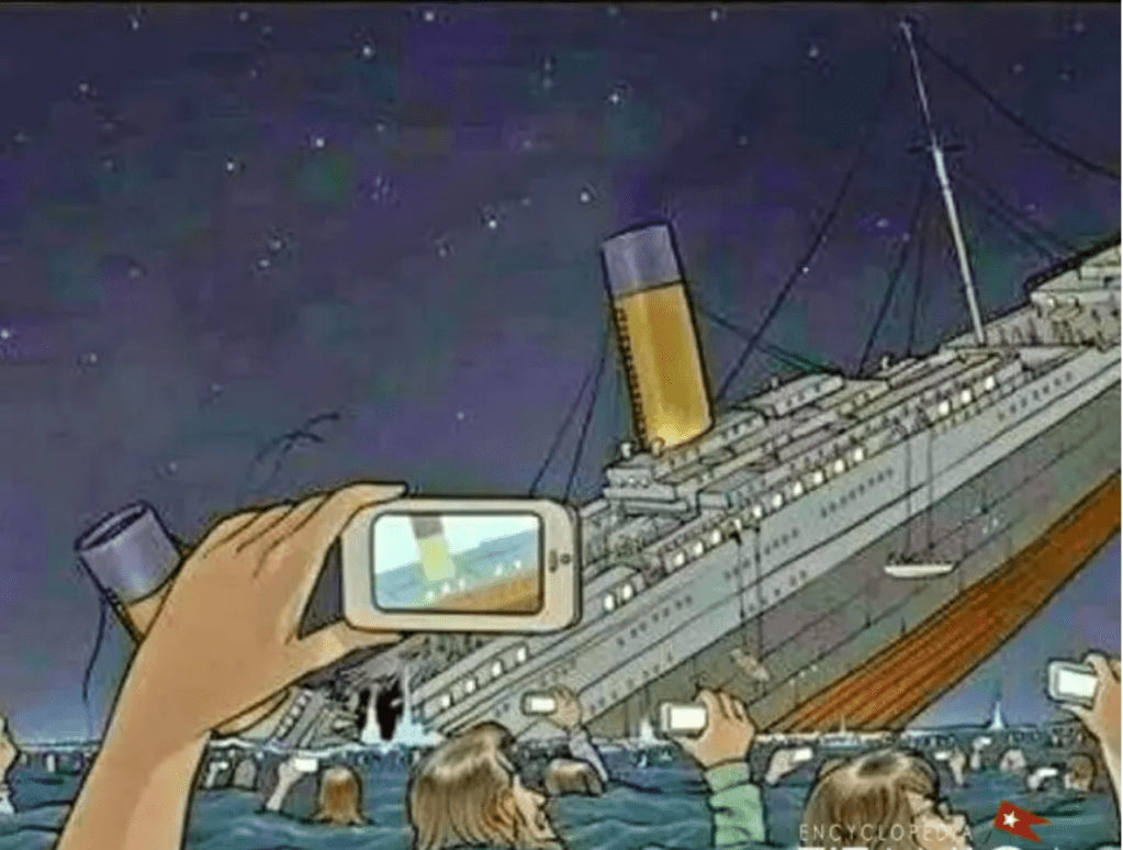 Titanic is a symbol for an economy based on the idea of unlimited growth. We keep dancing on that sinking fossil fueled steamer until salty water gargles into the violins and dampens their sound.