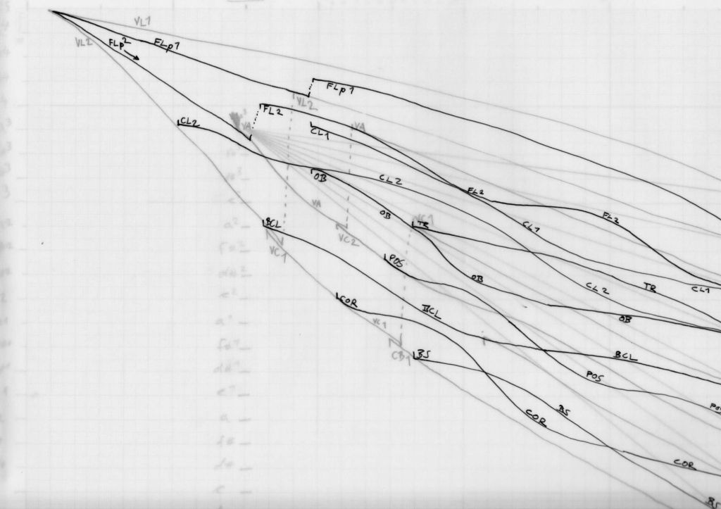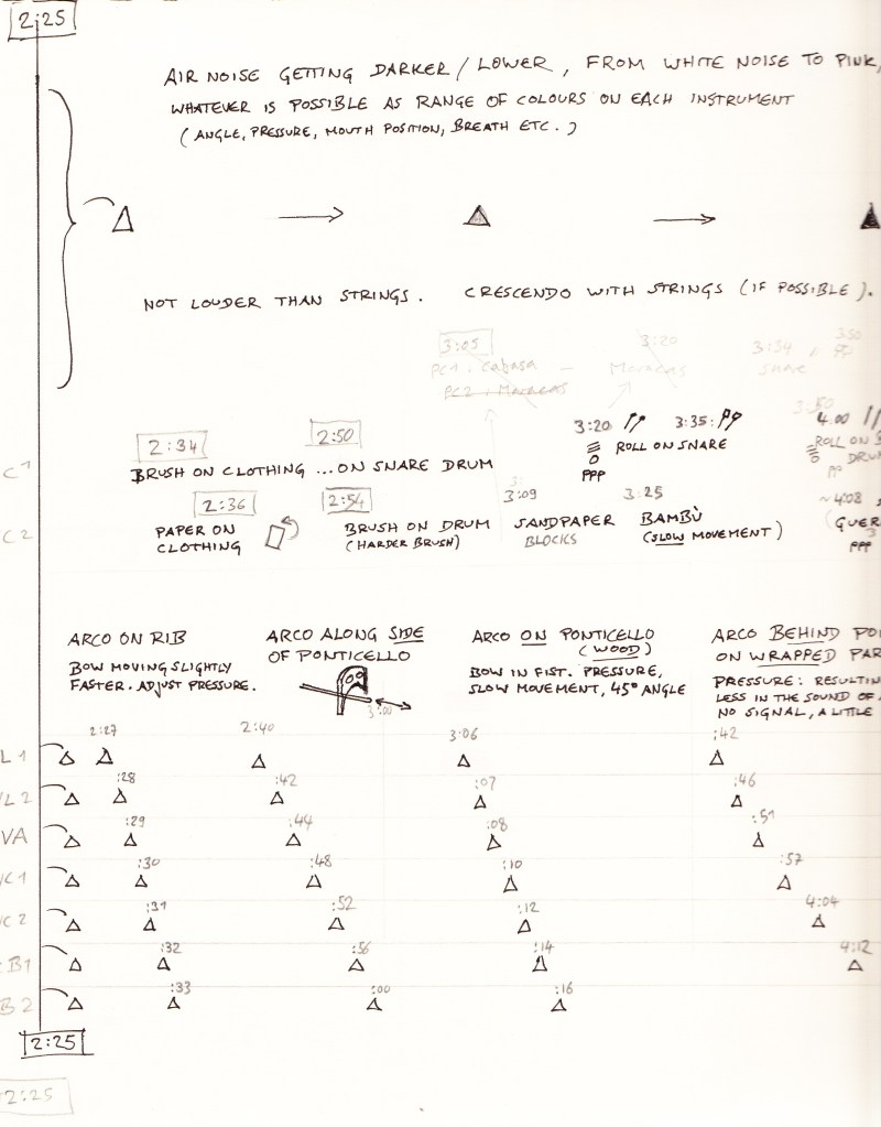 It starts with the highest instruments, violins and piccolo flutes (wind instruments imitate the slide by bending down notes before changing to the next chromatic note and by starting the new note softer) and finally includes all orchestra instruments. Each instrument has their own gravitational line of sliding down, its form being influenced by the pull of the closest neighbour on the score.