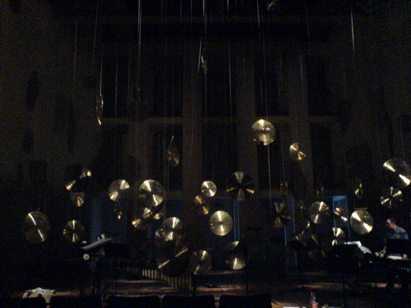 Die Musiker verteilen sich zwischen den Windgongs. Der Part dieses raumfüllenden Instruments ist zum Teil installiert, zum Teil notiert in den Schlagzeugparts.